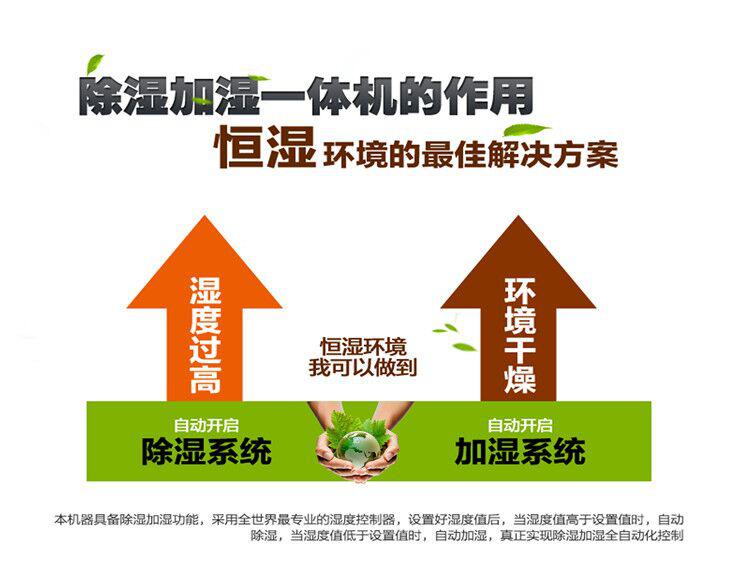 ◎除濕加濕一體機(jī)的作用:一臺(tái)機(jī)器具備除濕功能、加濕功能,設(shè)置好濕度,當(dāng)房間濕度值高于設(shè)置的濕度值時(shí),電腦板控制系統(tǒng)會(huì)起動(dòng)機(jī)器除濕功能模塊來(lái)進(jìn)行除濕,除濕的水經(jīng)排水管自動(dòng)排出,達(dá)到設(shè)定的濕度值時(shí)會(huì)自動(dòng)停機(jī);當(dāng)干燥天氣,設(shè)定的濕度值低于濕度值時(shí),電腦板控制系統(tǒng)會(huì)起動(dòng)機(jī)器加濕功能模塊來(lái)進(jìn)行加濕,加濕的水源需連接到機(jī)器上,為DN25進(jìn)水管,達(dá)到設(shè)定的濕度值時(shí)會(huì)自動(dòng)停機(jī);